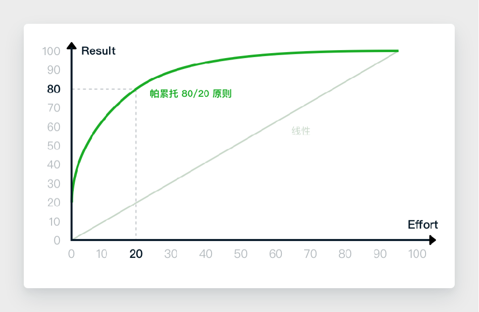 上世纪 40 年代,美国一位管理顾问 Joseph M Juran 观察到一个在商业以及生活中普遍存在的现象:在某一过程中,80% 的影响来自于 20% 的投入。他将这一现象以帕累托为名,称为“帕累托原则”。